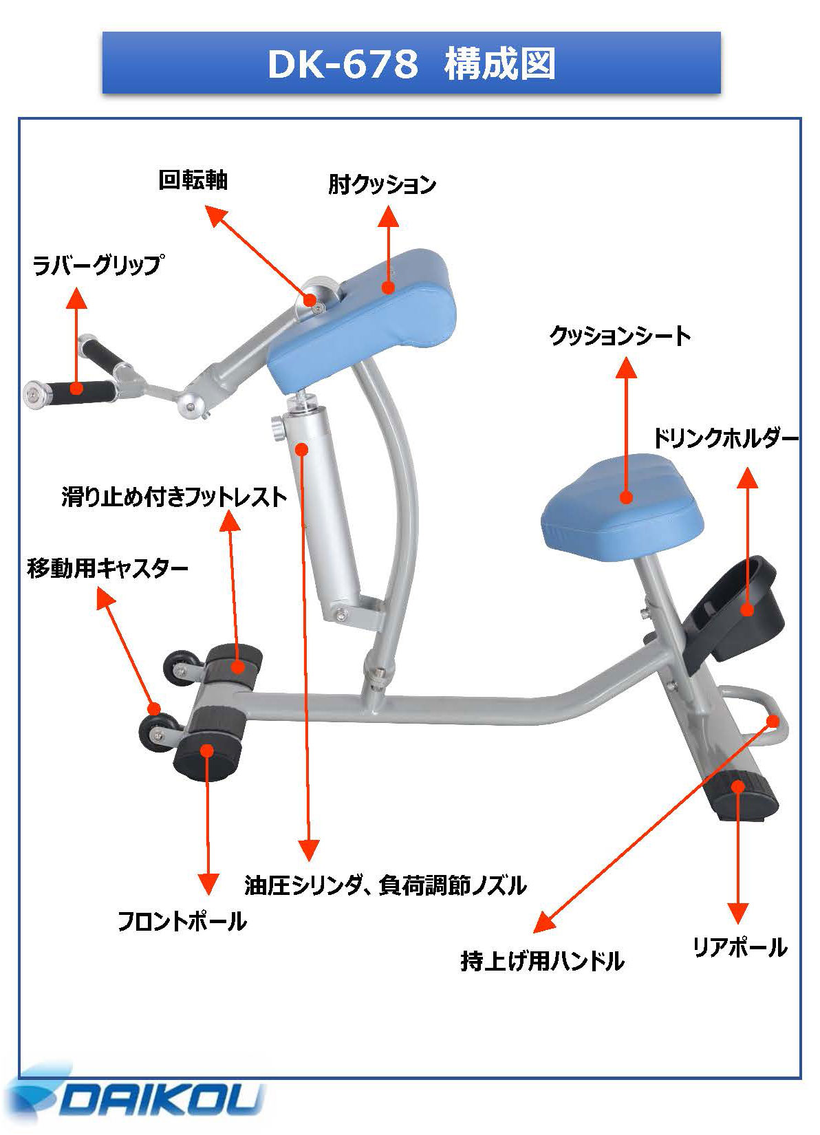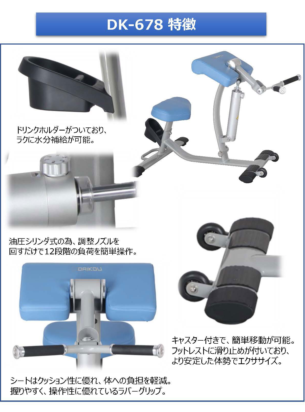DK-678は双方向油圧シリンダーを用いており、引く時・押す時それぞれに負荷がかかるので、1台で2種目のトレーニングが行えます。