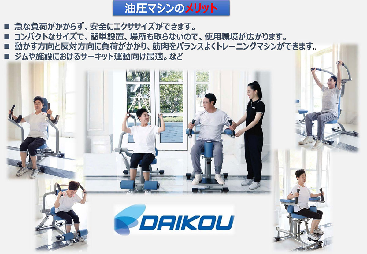 油圧GYMマシンは全身各部の機能改善を促す油圧式トレーニングマシンシリーズです。